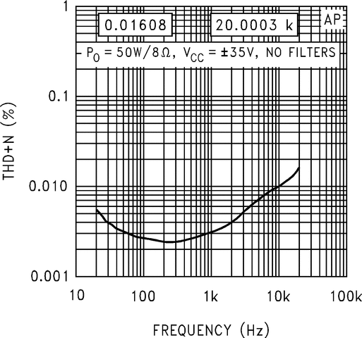 The LM3886 maintains an excellent signal-to-noise ratio of greater than 92dB with a typical low noise floor of 2.0µV. It exhibits extremely low THD+N values of 0.03% at the rated output into the rated load over the audio spectrum, and provides excellent linearity with an IMD (SMPTE) typical rating of 0.004%.