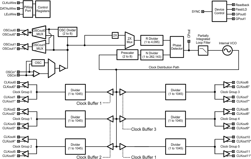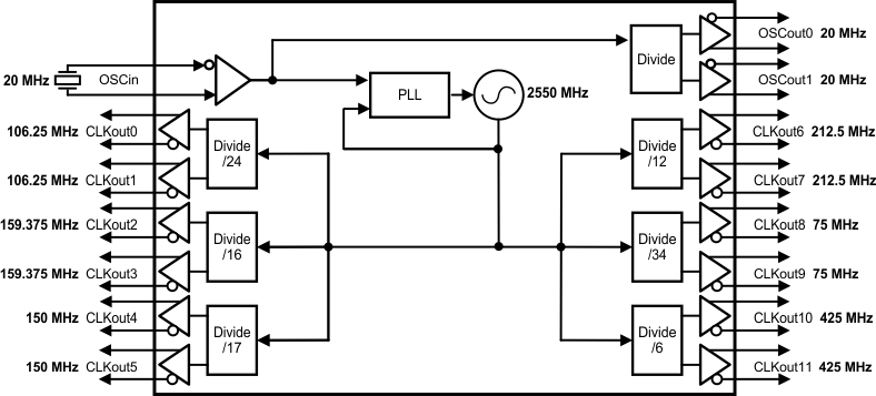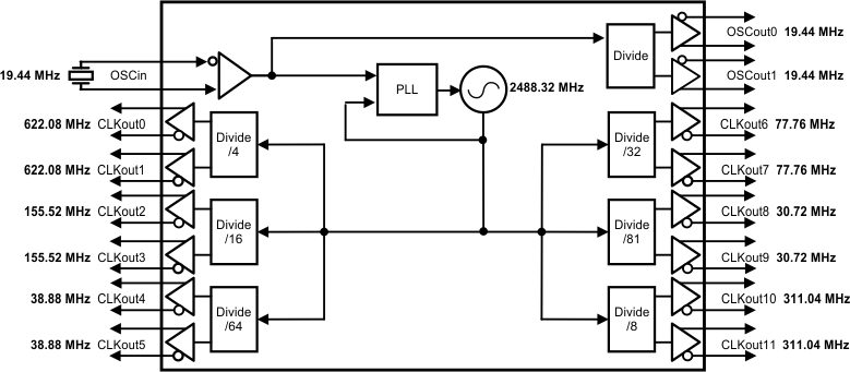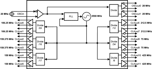 LMK03806 器件是一款高性能、超低抖动、多速率时钟发生器,能够在频率高达 2.6GHz 的条件下针对 14 路输出合成 8 个不同的频率。每个输出时钟可设定为 LVDS、LVPECL 或 LVCMOS 格式。LMK03806 集成了高性能的整数 N PLL、低噪声 VCO 和可编程输出分频器,能够以低成本的晶体为 SONET、以太网、光纤通道、XAUI、背板、PCIe、SATA 和网络处理器生成多个参考时钟。