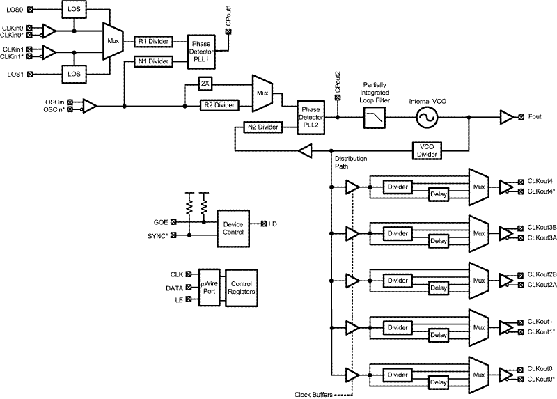 The LMK04000 family features dual redundant inputs, five differential outputs, and an optional default-clock upon power up. The input block is equipped with loss of signal detection and automatic or manual selection of the reference clock. Each clock output consists of a programmable divider, a phase synchronization circuit, a programmable delay, and an LVDS, LVPECL, or LVCMOS output buffer. The default startup clock is available on CLKout2 and it can be used to provide an initial clock for the field-programmable gate array (FPGA) or microcontroller that programs the jitter cleaner during the system power up sequence.