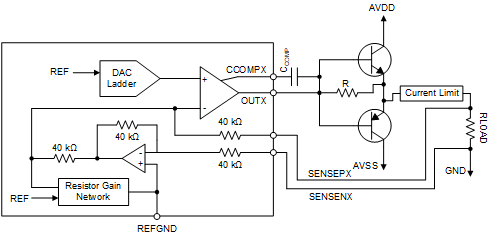 DACx1404 包含的上电复位电路可在上电时将 DAC 输出端连接至接地端。输出端会保持该模式,直至器件得到适当的运行配置。这些器件还包括其他可靠性特性,例如 CRC 误差校验、短路保护以及过热报警。