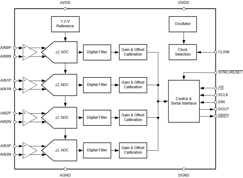 单独 ADC 通道可以根据传感器输入进行独立配置。低噪声、可编程增益放大器 (PGA) 提供了从 1 到 128 的增益,以放大低电平信号。该器件采用全局斩波模式来去除随温度变化和时间推移而产生的温漂。此外,该器件集成了失调电压和增益校准寄存器,有助于消除信号链误差。