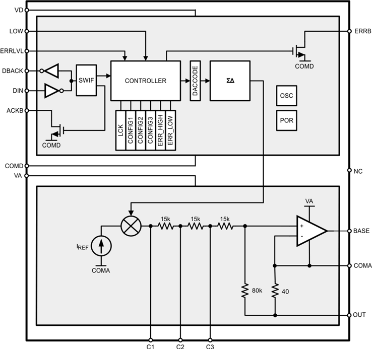 The data link to the DAC161P997 is a Single Wire Interface (SWIF) which allows sensor data to be transferred in digital format over an isolation boundary using a single isolation component. The DAC161P997s digital input is compatible with standard isolation transformers and opto-couplers. Error detection and handshaking features within the SWIF protocol ensure error free communication across the isolation boundary. For applications where isolation is not required, the DAC161P997 interfaces directly to a microcontroller.