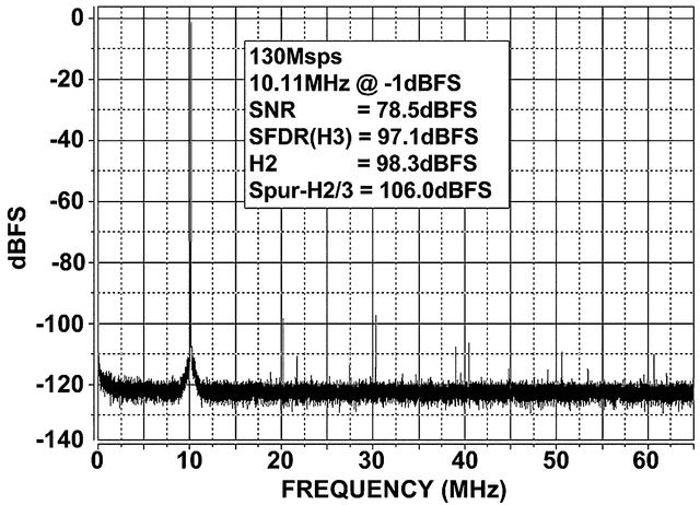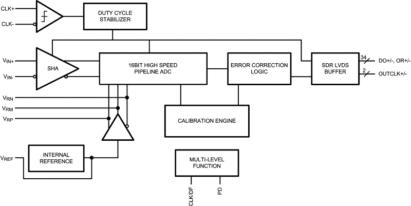 The ADC16V130 is a monolithic high performance CMOS analog-to-digital converter capable of converting analog input signals into 16-bit digital words at rates up to 130 Mega Samples Per Second (MSPS). This converter uses a differential, pipelined architecture with digital error correction and an on-chip sample-and-hold circuit to minimize power consumption and external component count while providing excellent dynamic performance. Automatic power-up calibration enables excellent dynamic performance and reduces part-to-part variation, and the ADC16V130 could be re-calibrated at any time by asserting and then de-asserting power-down. An integrated low noise and stable voltage reference and differential reference buffer amplifier easies board level design. On-chip duty cycle stabilizer with low additive jitter allows wide duty cycle range of input clock without compromising its dynamic performance. A unique sample-and-hold stage yields a full-power bandwidth of 1.4 GHz. The digital data is provided via full data rate LVDS outputs – making possible the 64-pin, 9mm x 9mm WQFN package. The ADC16V130 operates on dual power supplies +1.8V and +3.0V with a power-down feature to reduce the power consumption to very low levels while allowing fast recovery to full operation.