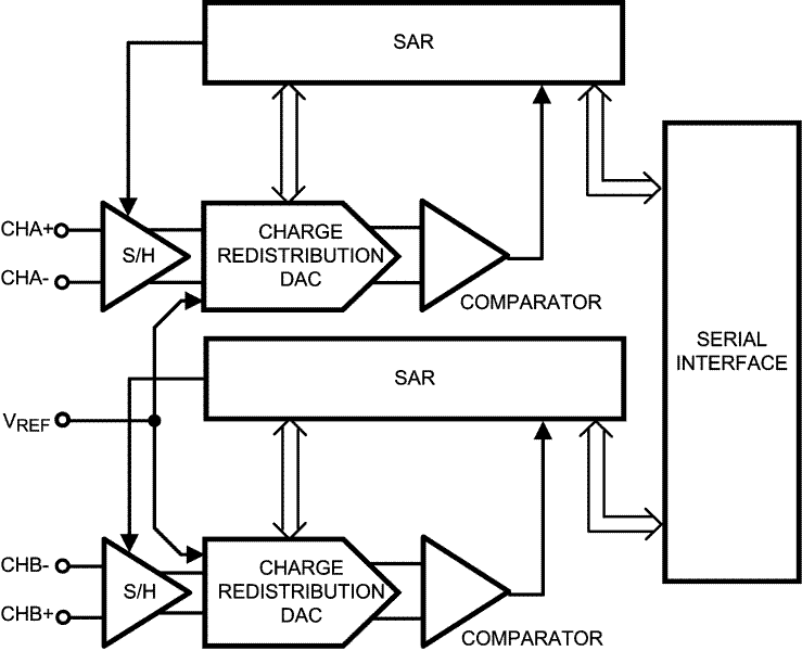 The ADC122S706 offers dual high-speed serial data outputs that are binary 2's complement and are compatible with several standards, such as SPI™, QSPI™, MICROWIRE, and many common DSP serial interfaces. Channel A's conversion result is outputted on DOUTA while Channel B's conversion result is outputted on DOUTB. This feature makes the ADC122S706 an excellent replacement for systems using two distinct ADCs in a simultaneous sampling application. The serial clock (SCLK) and chip select bar (CS) are shared by both channels. For lower power consumption, a single serial data output mode is externally selectable.