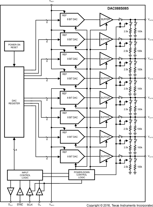 There are two references for the DAC088S085. One reference input serves channels A through D, while the other reference serves channels E through H. Each reference can be set independently between 0.5 V and VA, providing the widest possible output dynamic range. The DAC088S085 has a 16-bit input shift register that controls the mode of operation, the power-down condition, and the DAC channels register and output value. All eight DAC outputs can be updated simultaneously or individually.
