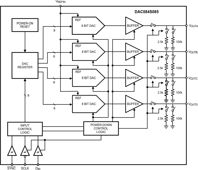 The reference for the DAC084S085 serves all four channels and can vary in voltage between 1 V and VA, providing the widest possible output dynamic range. The DAC084S085 has a 16-bit input shift register that controls the outputs to be updated, the mode of operation, the power-down condition, and the binary input data. All four outputs can be updated simultaneously or individually depending on the setting of the two mode of operation bits.