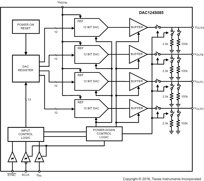 The reference for the DAC124S085 serves all four channels and can vary in voltage between 1 V and VA, providing the widest possible output dynamic range. The DAC124S085 has a 16-bit input shift register that controls the outputs to be updated, the mode of operation, the power-down condition, and the binary input data. All four outputs can be updated simultaneously or individually depending on the setting of the two mode of operation bits.