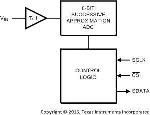 The ADC081S021 device is a low-power, single-channel CMOS 8-bit analog-to-digital converter with a high-speed serial interface. Unlike the conventional practice of specifying performance at a single sample rate only, the ADC081S021 is fully specified over a sample rate range of 50 ksps to 200 ksps. The converter is based upon a successive-approximation register architecture with an internal track-and-hold circuit.