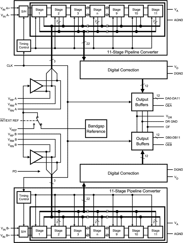 The differential inputs provide a full scale differential input swing equal to 2 times VREF with the possibility of a single-ended input. Full use of the differential input is recommended for optimum performance. The digital outputs from the two ADCs are available on separate 12-bit buses with an output data format choice of offset binary or two’s complement.
