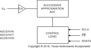 The ADCS7476, ADCS7477, and ADCS7478 devices are low power, monolithic CMOS 12-, 10-, and 8-bit analog-to-digital converters that operate at 1 MSPS. The ADCS747x devices are a drop-in replacement for Analog Devices AD747x. Each device is based on a successive approximation register architecture with internal track-and-hold. The serial interface is compatible with several standards, such as SPI, QSPI, MICROWIRE, and many common DSP serial interfaces.