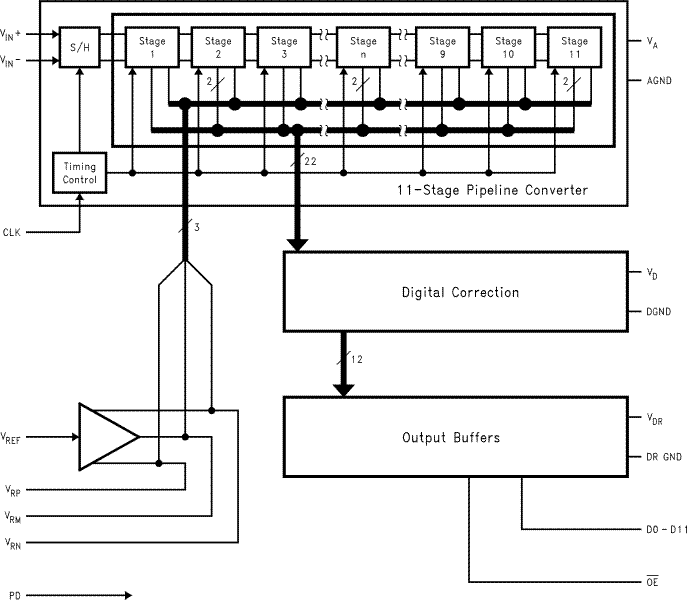 The differential inputs provide a full scale input swing equal to ±VREF with the possibility of a single-ended input. Full use of the differential input is recommended for optimum performance. For ease of use, the buffered, high impedance, single-ended reference input is converted on-chip to a differential reference for use by the processing circuitry. Output data format is 12-bit offset binary.