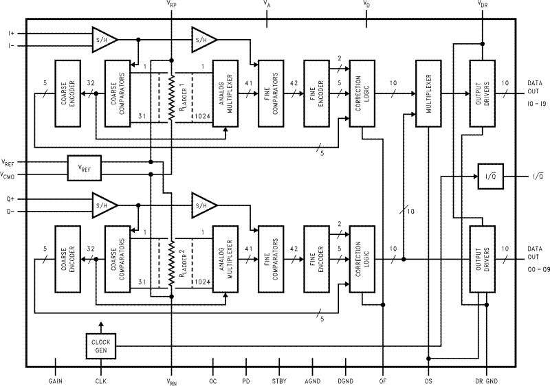 The ADC10D040 is a dual low power, high performance CMOS analog-to-digital converter that digitizes signals to 10 bits resolution at sampling rates up to 45 MSPS while consuming a typical 267 mW from a single 3.3V supply. No missing codes is specified over the full operating temperature range. The unique two stage architecture achieves 9.4 Effective Bits over the entire Nyquist band at 40 MHz sample rate. An output formatting choice of offset binary or 2's complement coding and a choice of two gain settings eases the interface to many systems. Also allowing great flexibility of use is a selectable 10-bit multiplexed or 20-bit parallel output mode. An offset correction feature minimizes the offset error.