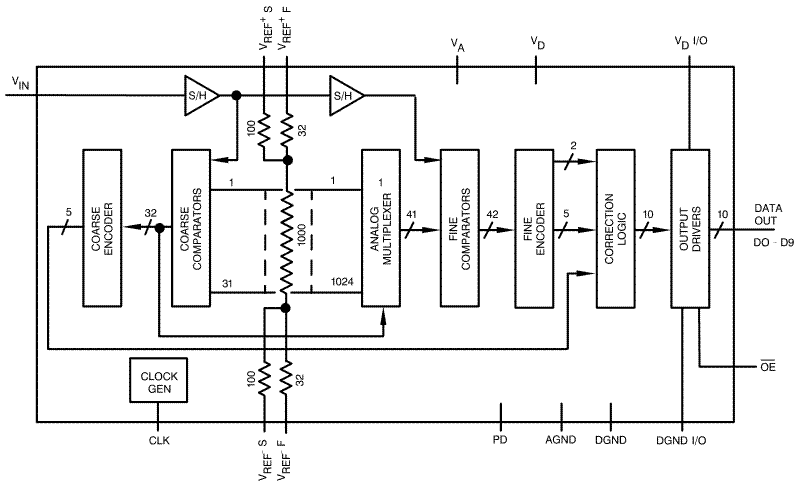 The ADC10321 is a low power, high performance CMOS analog-to-digital converter that digitizes signals to 10 bits resolution at sampling rates up to 25Msps while consuming a typical 98mW from a single 5V supply. Reference force and sense pins allow the user to connect an external reference buffer amplifier to ensure optimal accuracy. No missing codes is ensured over the full operating temperature range. The unique two stage architecture achieves 9.2 Effective Bits with a 10MHz input signal and a 20MHz clock frequency. Output formatting is straight binary coding.