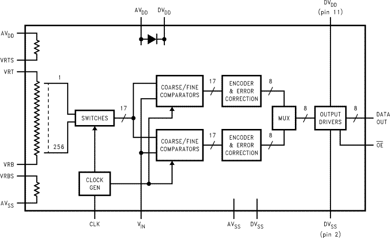 The excellent DC and AC characteristics of this device, together with its low power consumption and +3V single supply operation, make it ideally suited for many video, imaging and communications applications, including use in portable equipment. Furthermore, the ADC1173 is resistant to latch-up and the outputs are short-circuit proof. The top and bottom of the ADC1173's reference ladder is available for connections, enabling a wide range of input possibilities.