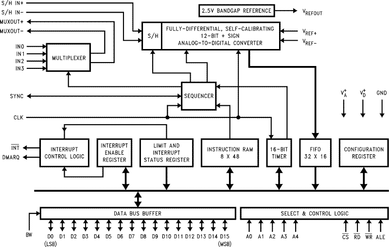 Programmable acquisition times and conversion rates are possible through the use of internal clock-driven timers. The reference voltage input can be externally generated for absolute or ratiometric operation or can be derived using the internal 2.5V bandgap reference.