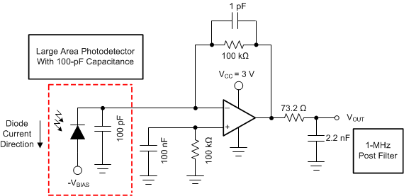 以 6V/V 的最小建议同相增益运行时会产生 90MHz、–3dB 带宽。超低的输入噪声和失调电压使 OPA838 成为高增益的理想选择。即使在 1000V/V 的直流耦合增益下,也可获得 300kHz 的信号带宽,且最大输出失调电压为 ±125mV。