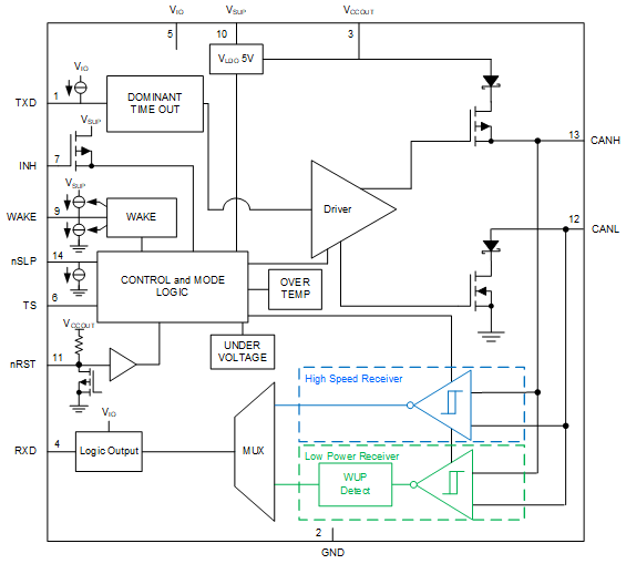 TCAN1162x-Q1 可通过 INH 输出引脚选择性启用系统上可能存在的各种电源,从而在整个系统级别减少电池电流消耗。这使得在超低电流睡眠模式中,功率传送到除 TCAN1162x-Q1 以外的所有系统元件,同时对 CAN 总线进行监控。检测到唤醒事件时, TCAN1162x-Q1 通过将 INH 驱动至高电平来启动系统。