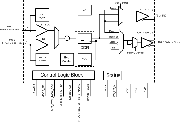 非破坏性眼图监视器支持实时测量串行数据,从而简化系统启动或现场调试过程。LMH1218 可通过 SPI 或 SMBus 接口进行编程。