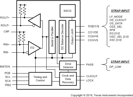 Programmable transmit de-emphasis, receive equalization, on-chip scrambling, and DC balancing enables longer distance transmission over lossy cables and backplanes. The DS92LV2422 automatically locks to incoming data without an external reference clock or special sync patterns, providing easy plug-and-go operation. EMI is minimized by the use of low voltage differential signaling, receiver drive strength control, and spread spectrum clocking capability.