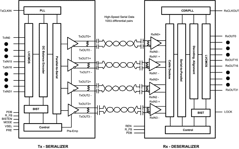 On-chip data Randomization/Scrambling and DC balance encoding and selectable serializer Pre-emphasis ensure a robust, low-EMI transmission over longer, lossy cables and backplanes. The Deserializer automatically locks to incoming data without an external reference clock or special sync patterns, providing an easy “plug-and-lock” operation.