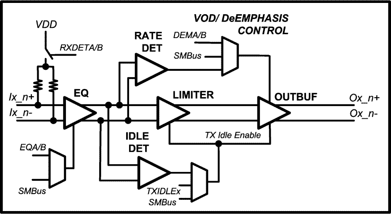 The device will change the load impedance on its input pins based on the state of RXDETA/B inputs detection. An internal rate detection circuit is included to detect if an incoming data stream is at Gen2 data rates, and adjusts the de-emphasis on it's output accordingly. The signal conditioning provided by the device allows systems to upgrade from Gen1 data rates to Gen2 without reducing their physical reach. This is true for FR4 applications such as backplanes, as well as cable interconnect.