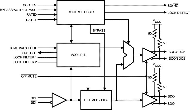 The LMH0046 automatically detects the incoming data rate and adjusts itself to retime the incoming data to suppress accumulated jitter. The LMH0046 recovers the serial data-rate clock and optionally provides it as an output. The LMH0046 has two differential serial data outputs; the second output may be selected as a low-jitter, data-rate clock output. Controls and indicators are: serial clock or second serial data output select, manual rate select input, SD/HD rate indicator output, lock detect output, auto/manual data bypass and output mute. The serial data inputs, outputs, and serial data-rate clock outputs are differential LVPECL compatible. The CML serial data and serial data-rate clock outputs are suitable for driving 100Ω differentially terminated networks. The control logic inputs and outputs are LVCMOS compatible.