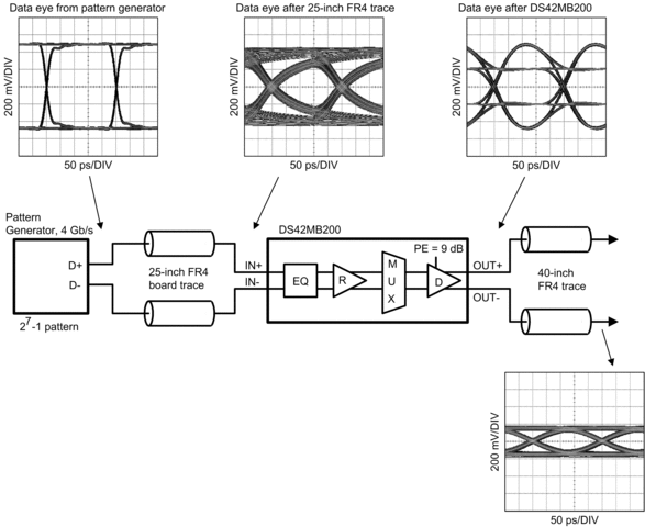 The DS42MB200 is a dual signal conditioning 2:1 multiplexer and 1:2 fan-out buffer designed for use in backplane redundancy applications. Signal conditioning features include input equalization and programmable output pre-emphasis that enable data communication in FR4 backplanes up to 4.25 Gbps. Each input stage has a fixed equalizer to reduce ISI distortion from board traces.