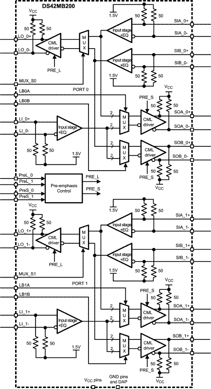 All output drivers have 4 selectable steps of pre-emphasis to compensate for transmission losses from long FR4 backplanes and reduce deterministic jitter. The pre-emphasis levels can be independently controlled for the line-side and switch-side drivers. The internal loopback paths from switch-side input to switch-side output enable at-speed system testing. All receiver inputs are internally terminated with 100Ω differential terminating resistors. All driver outputs are internally terminated with 50Ω to VCC.