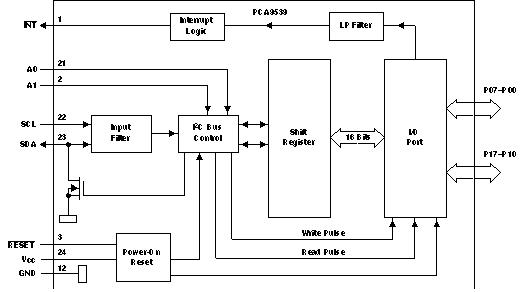 INT can be connected to the interrupt input of a microcontroller. By sending an interrupt signal on this line, the remote I/O can inform the microcontroller if there is incoming data on its ports without having to communicate via the I2C bus. Thus, the PCA9539 can remain a simple slave device.