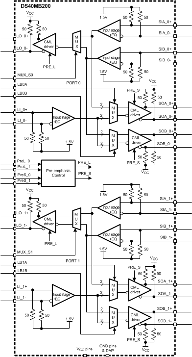 All output drivers have four selectable steps of pre-emphasis to compensate for transmission losses from long FR4 backplanes and reduce deterministic jitter. The pre-emphasis levels can be independently controlled for the line-side and switch-side drivers. The internal loopback paths from switch-side input to switch-side output enable at-speed system testing. All receiver inputs are internally terminated with 100-Ω differential terminating resistors. All drivers are internally terminated with 50 Ω to VCC.
