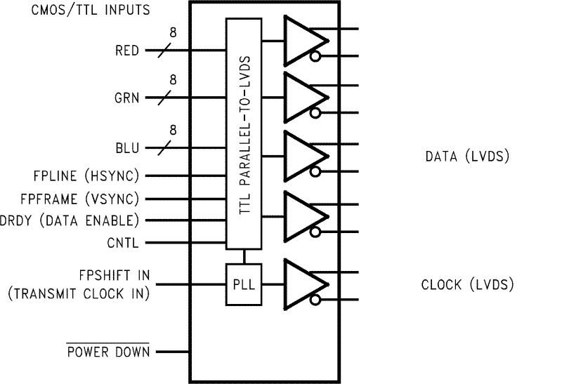 The DS90C385A transmitter converts 28 bits of LVCMOS/LVTTL data into four LVDS (Low Voltage Differential Signaling) data streams. A phase-locked transmit clock is transmitted in parallel with the data streams over the fifth LVDS link. Every cycle of the transmit clock 28 bits of input data are sampled and transmitted. At a transmit clock frequency of 87.5 MHz, 24 bits of RGB data and 3 bits of LCD timing and control data (FPLINE, FPFRAME, DRDY) are transmitted at a rate of 612.5Mbps per LVDS data channel. Using a 87.5 MHz clock, the data throughput is 306.25Mbytes/sec. This transmitter can be programmed for Rising edge strobe or Falling edge strobe through a dedicated pin. A Rising edge or Falling edge strobe transmitter will interoperate with a Falling edge strobe FPDLink Receiver without any translation logic.