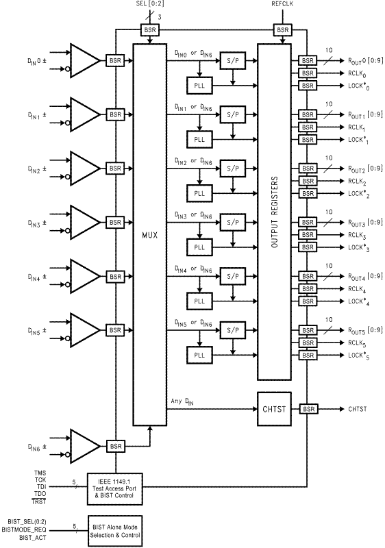 The SCAN921260 integrates six deserializer devices into a single chip. The SCAN921260 can simultaneously deserialize up to six data streams that have been serialized by the Texas Instruments SCAN921023 Bus LVDS serializer. The device also includes a seventh serial input channel that serves as a redundant input.