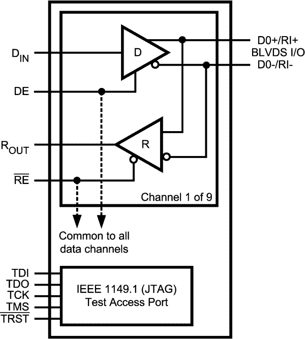 The receiver threshold is less than ±100 mV over a ±1V common mode range and translates the differential Bus LVDS to standard (TTL/CMOS) levels.