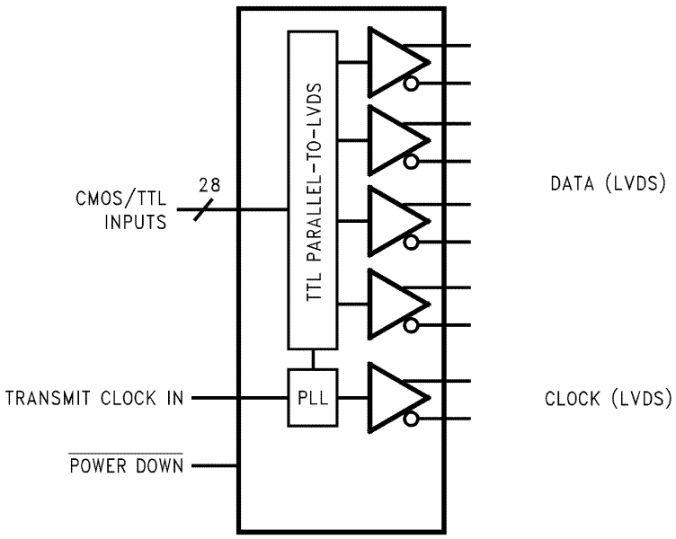 The DS90CR287 transmitter converts 28 bits of LVCMOS/LVTTL data into four LVDS (Low Voltage Differential Signaling) data streams. A phase-locked transmit clock is transmitted in parallel with the data streams over a fifth LVDS link. Every cycle of the transmit clock 28 bits of input data are sampled and transmitted.