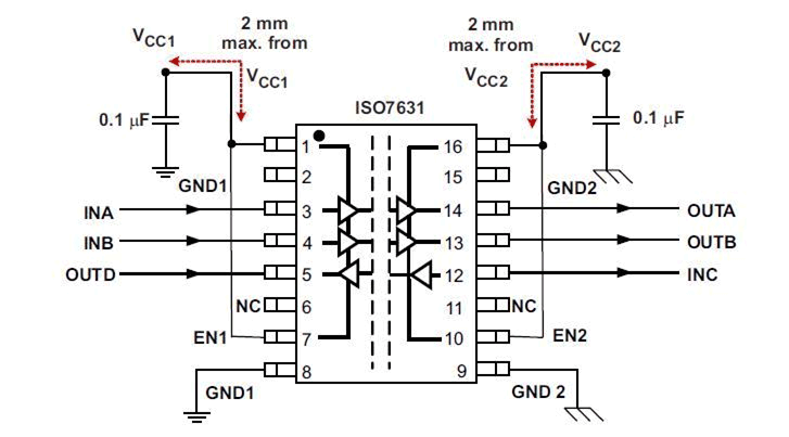 每个隔离通道都有一个由二氧化硅 (SiO2) 绝缘隔栅分开的逻辑输入和输出缓冲器。 与隔离电源配合使用,这些器件可防止数据总线或者其它电路上的噪声电流进入本地接地或者干扰或损坏敏感电路。 此器件具有 TTL 输入阀值并可在 2.7V(M 级),3.3V 和 5V 电源供电的情况下运行。 当由 3.3V 或者 2.7V 电源供电时,所有输入均可耐受 5V 电压。