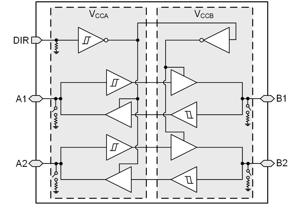 SN74LXC2T45-Q1 是一款 2 位双电源同相双向电压电平转换器件。Ax 引脚和控制引脚 (DIR) 以 VCCA 逻辑电平为基准,Bx 引脚以 VCCB 逻辑电平为基准。A 端口能够接受 1.1V 至 5.5V 的 I/O 电压,而 B 端口可接受 1.1V 至 5.5V 的 I/O 电压。DIR 上为高电平时允许数据从 A 传输到 B,DIR 上为低电平时允许数据从 B 传输到 A。请参阅器件功能模式,简要了解控制逻辑运行。