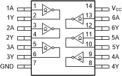 此器件包含六个具有开漏输出的独立反相器。每个逻辑门以正逻辑执行布尔函数 Y = A。
