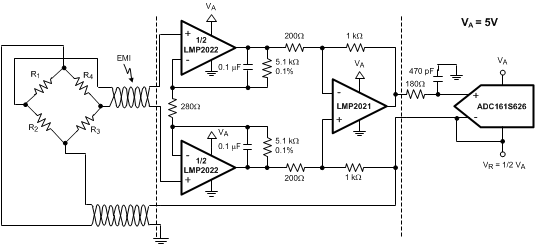 With only 260 nVPP (0.1 Hz to 10 Hz) of input voltage noise and no 1/f noise component, the LMP202x are suitable for low frequency applications such as industrial precision weigh scales. The extremely high open loop gain of 160 dB drastically reduces gain error in high gain applications. With ultra precision DC specifications and very low noise, the LMP202x are ideal for position sensors, bridge sensors, pressure sensors, medical equipment and other high accuracy applications with very low error budgets.