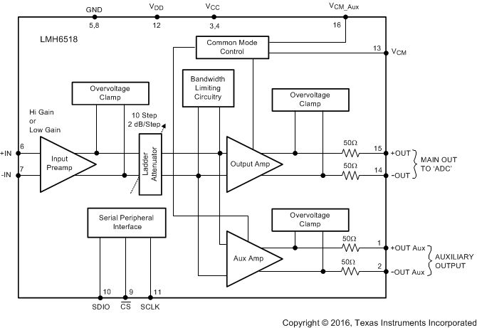 The LMH6518 gain is programmed through a SPI-1 compatible serial bus. A signal path combined gain resolution of 8.5 mdB is achieved when the device's gain and the Gsps ADC’s FS input are both manipulated. Inputs and outputs are DC-coupled. The outputs are differential with individual common mode (CM) voltage control (for main and auxiliary outputs), and have a selectable bandwidth limiting circuitry (common to both main and auxiliary) of 20, 100, 200, 350, 650, 750 MHz or full bandwidth.
