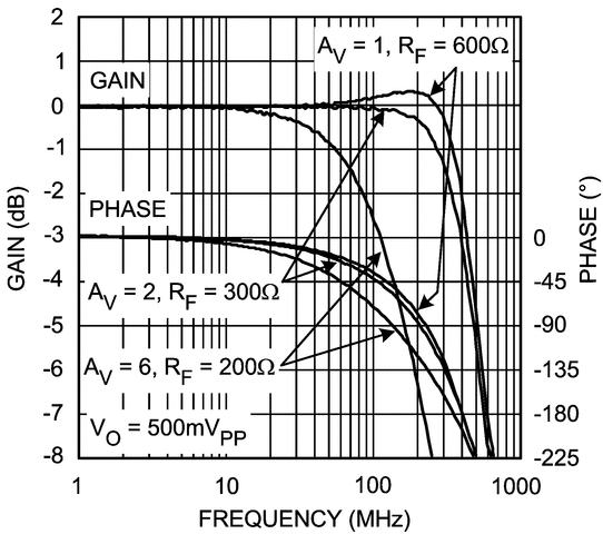 The LMH6714/LMH6720/LMH6722 series combine Texas Instruments' VIP10 high speed complementary bipolar process with Texas Instruments' current feedback topology to produce a very high speed op amp. These amplifiers provide a 400MHz small signal bandwidth at a gain of +2V/V and a 1800V/μs slew rate while consuming only 5.6mA from ±5V supplies.